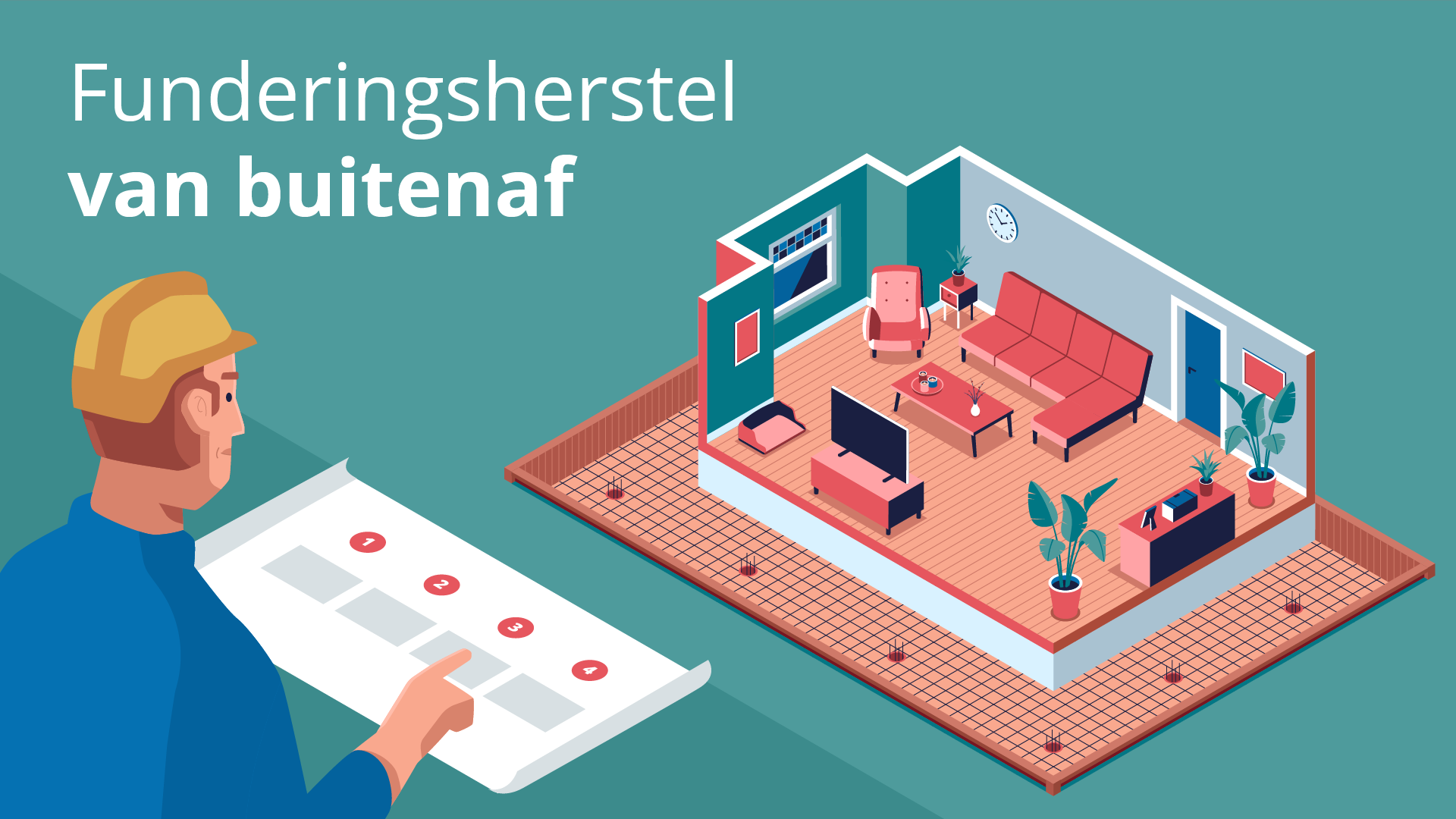 Bij funderingsherstel van buitenaf, leggen we de oude fundering rondom de woning bloot. Naast de oude fundering worden nieuwe palen in de grond getrild of geschroefd en deze palen worden verbonden met de oude funderingsbalken. Op deze manier wordt de woning rondom gedragen door de nieuwe fundering die buitenom de woning is aangebracht. Tijdens deze werkzaamheden kan de woning gewoon bewoond blijven.